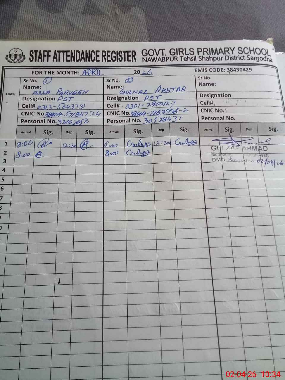 | Name: AS**** PA**** Designation: (School Headmaster's/Headmistress's) PST (Sc-Math) Phone/Cell Number: 03**** |