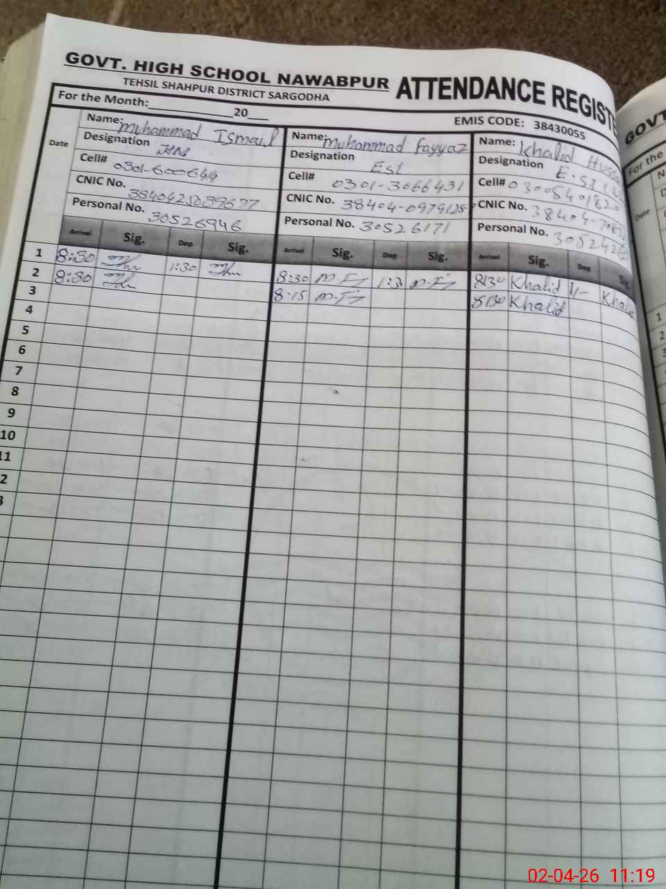 | Name: MU**** IS**** Designation: (School Headmaster's/Headmistress's) EST I/C HEADMASTER Phone/Cell Number: 03**** |