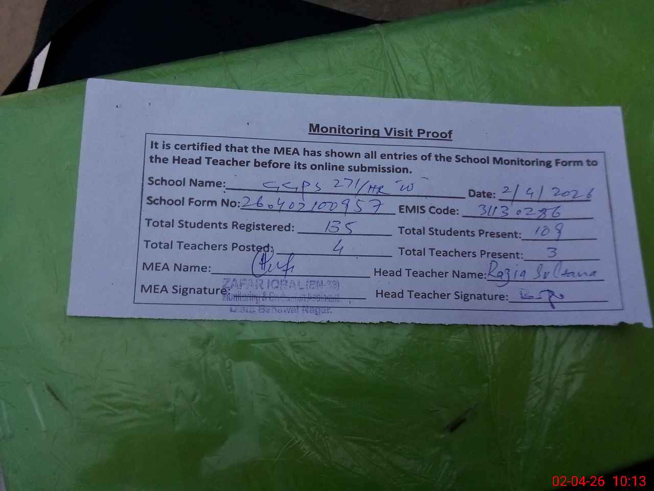 | EMIS Code: 31130286 | Name of School: GGPS CHAK NO 271 HR W | |||