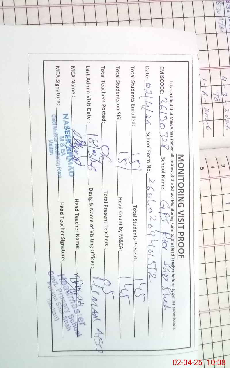 | EMIS Code: 36130328 | Name of School: GPS PURANA SHER SHAH MULTAN | |||