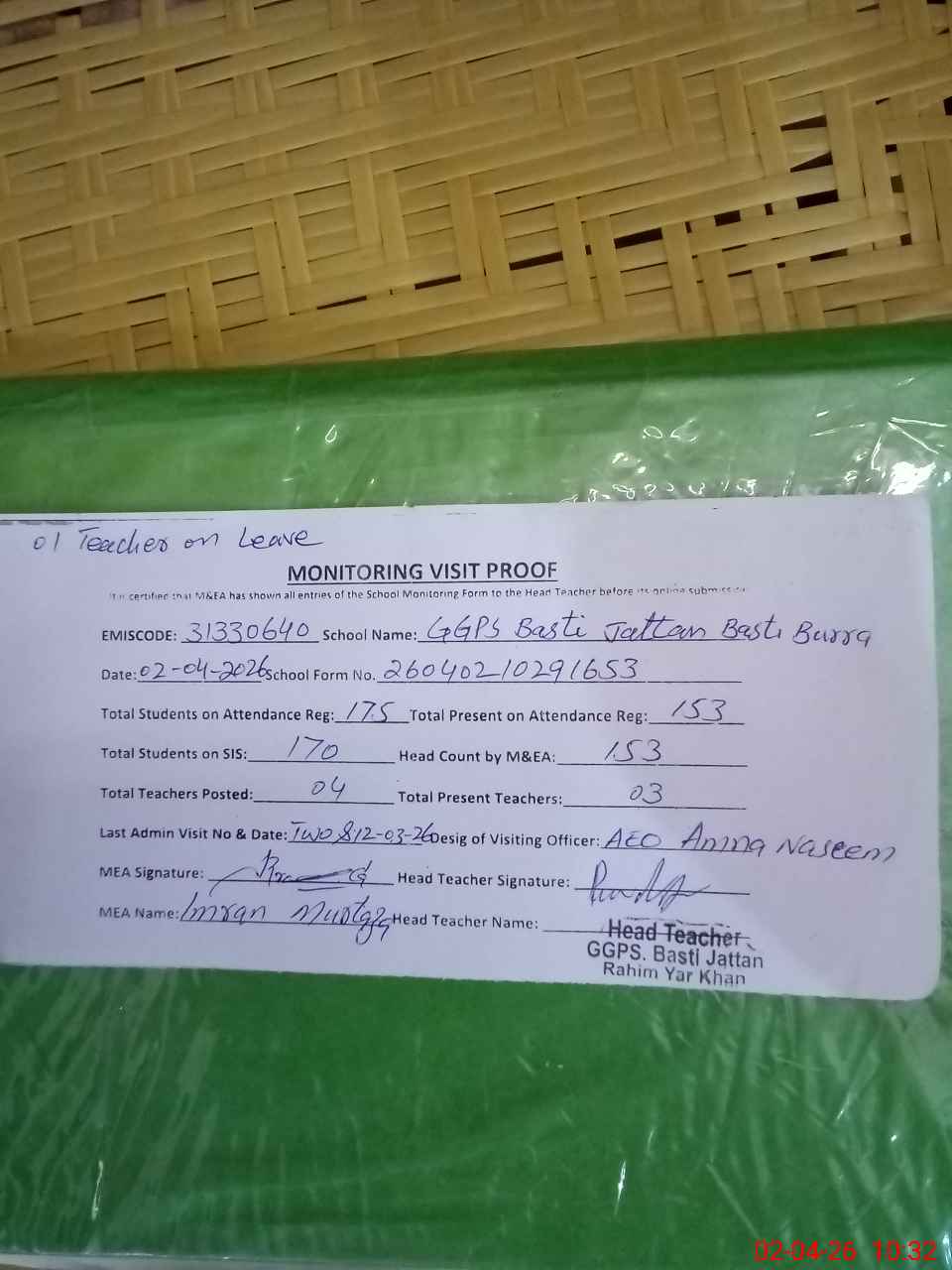 | EMIS Code: 31330640 | Name of School: GGPS BASTI JATTAN R.Y.KHAN (Basti Burra) | |||