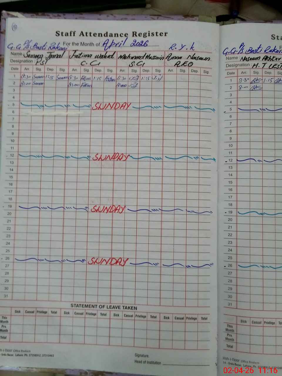 | Leave | Duty | Absent | Maternity | Medical | Ex- Pak |