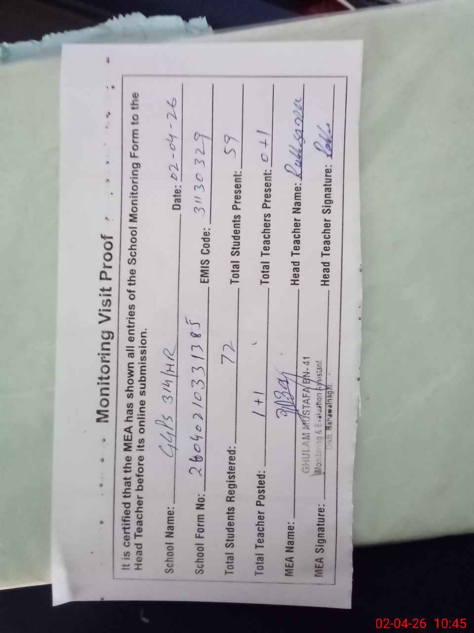 | Attendance Register | Head Teacher | MEA with School | Visit Proof |