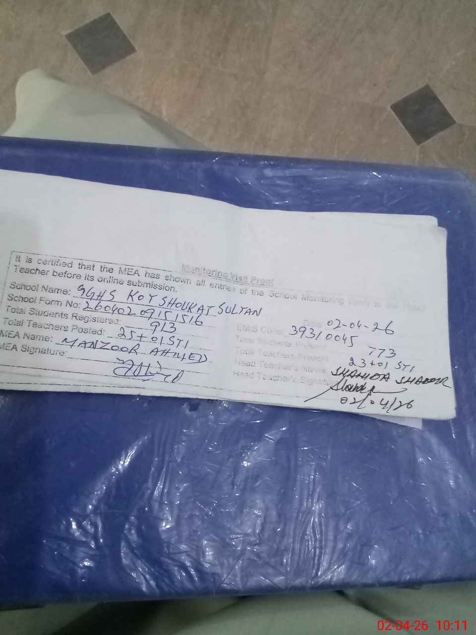 | Name: SH**** SH**** Designation: (School Headmaster's/Headmistress's) I / C SST Phone/Cell Number: 03**** |