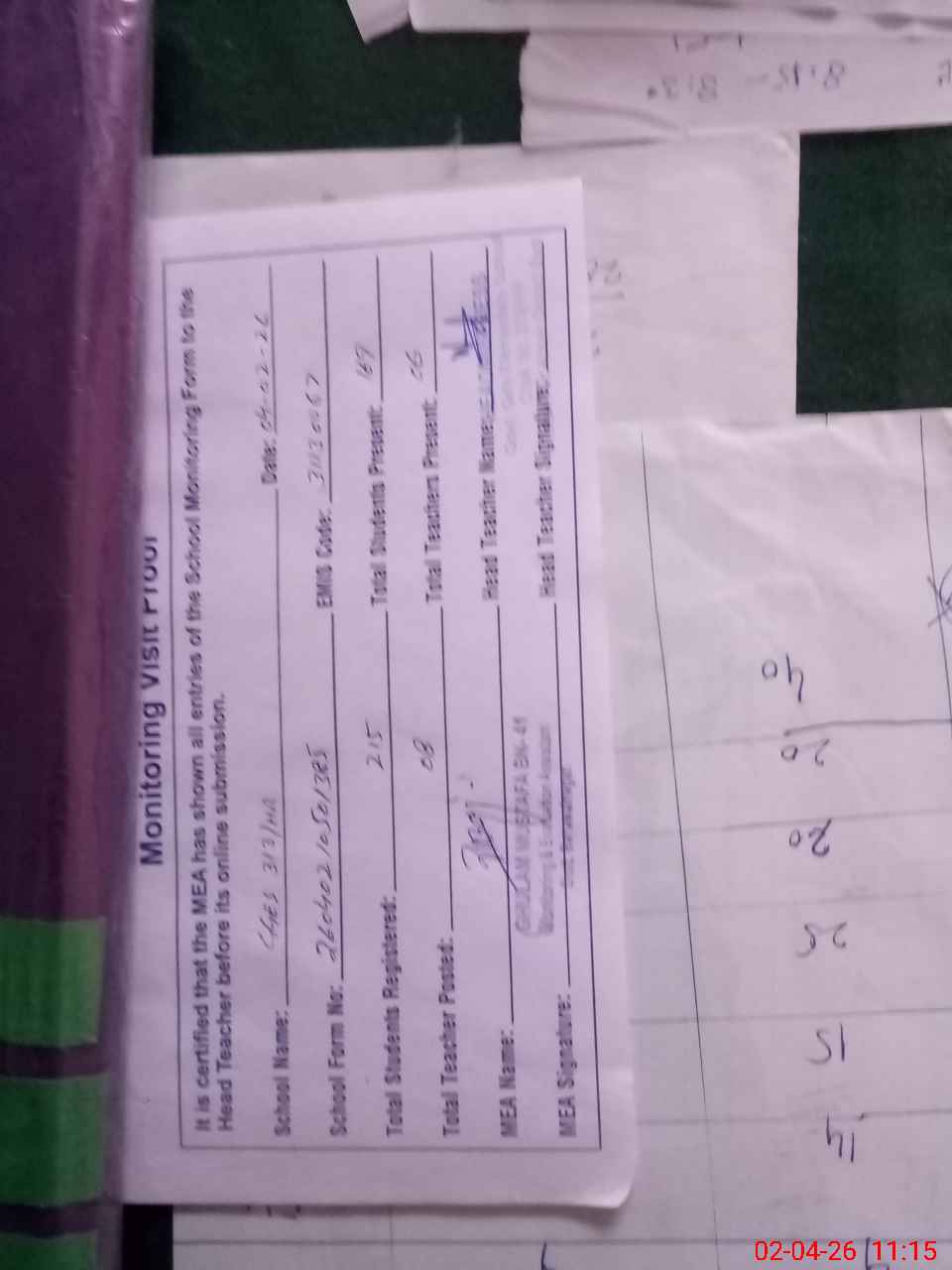 | Attendance Register | Head Teacher | MEA with School | Visit Proof |