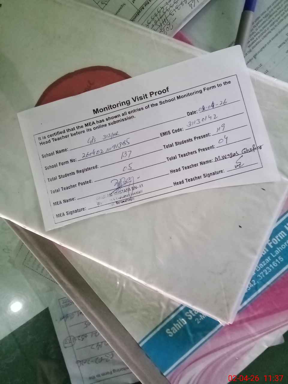 | Attendance Register | Head Teacher | MEA with School | Visit Proof |