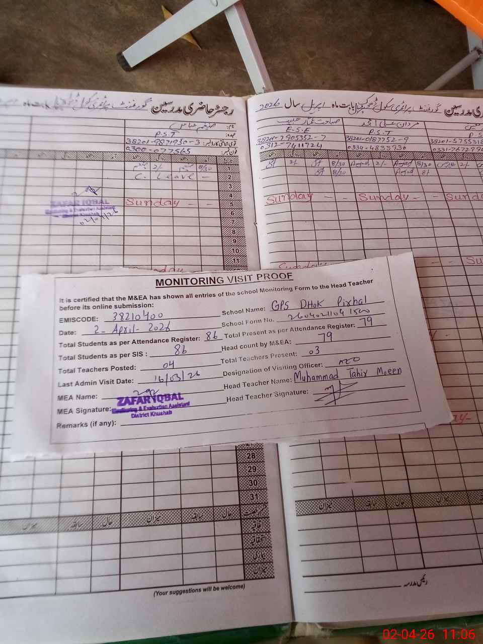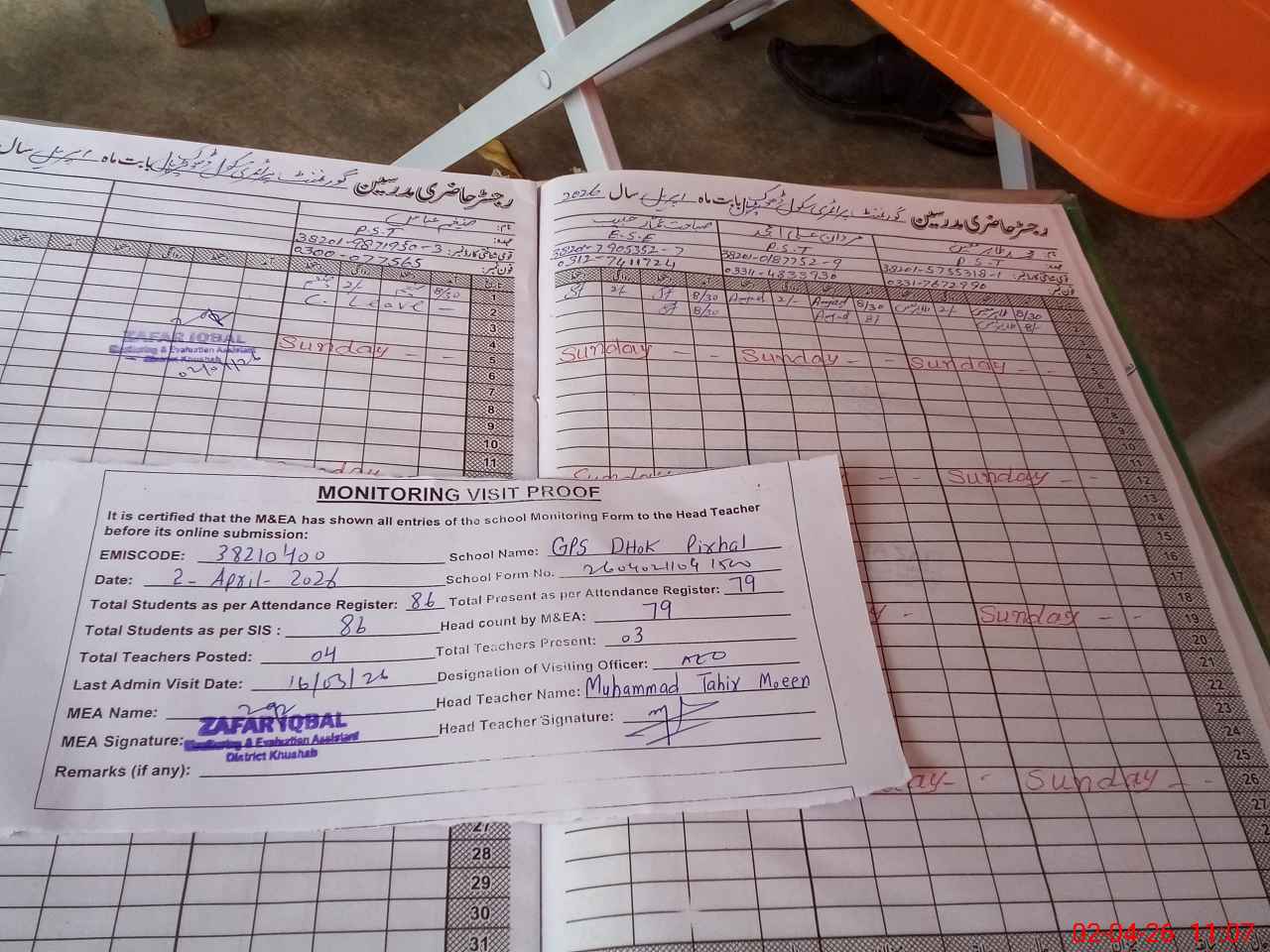 | Attendance Register | Head Teacher | MEA with School | Visit Proof |
