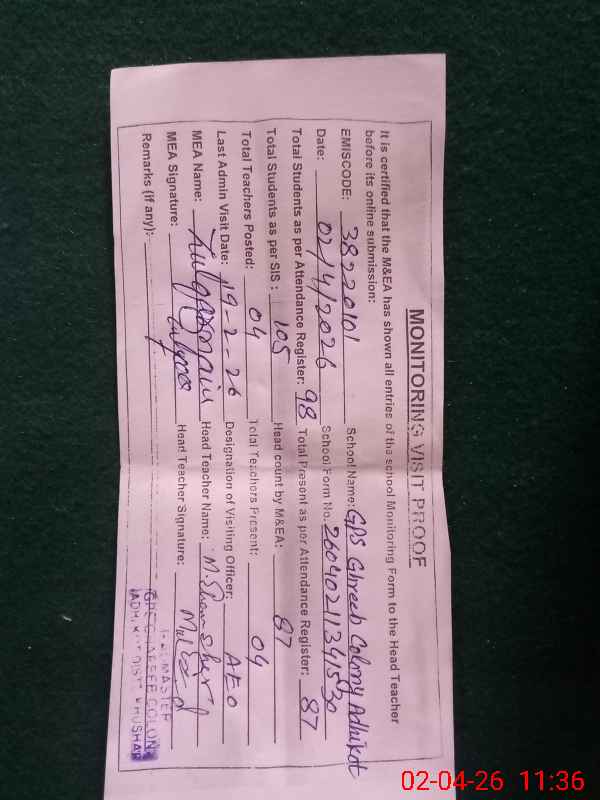 | EMIS Code: 38220101 | Name of School: GPS GHEREEB COLONY, ADHI KOT | |||