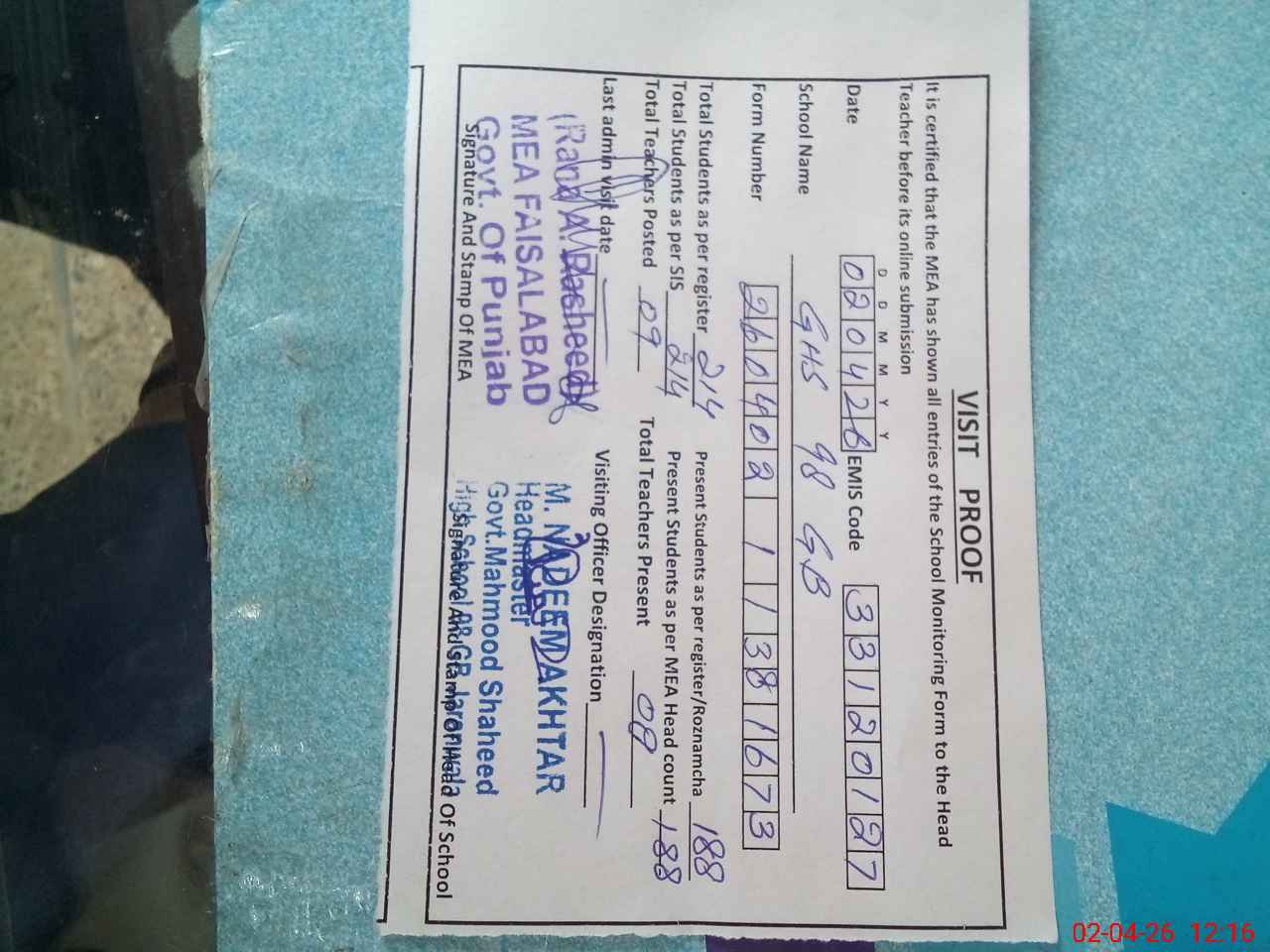 | Attendance Register | Head Teacher | MEA with School | Visit Proof |