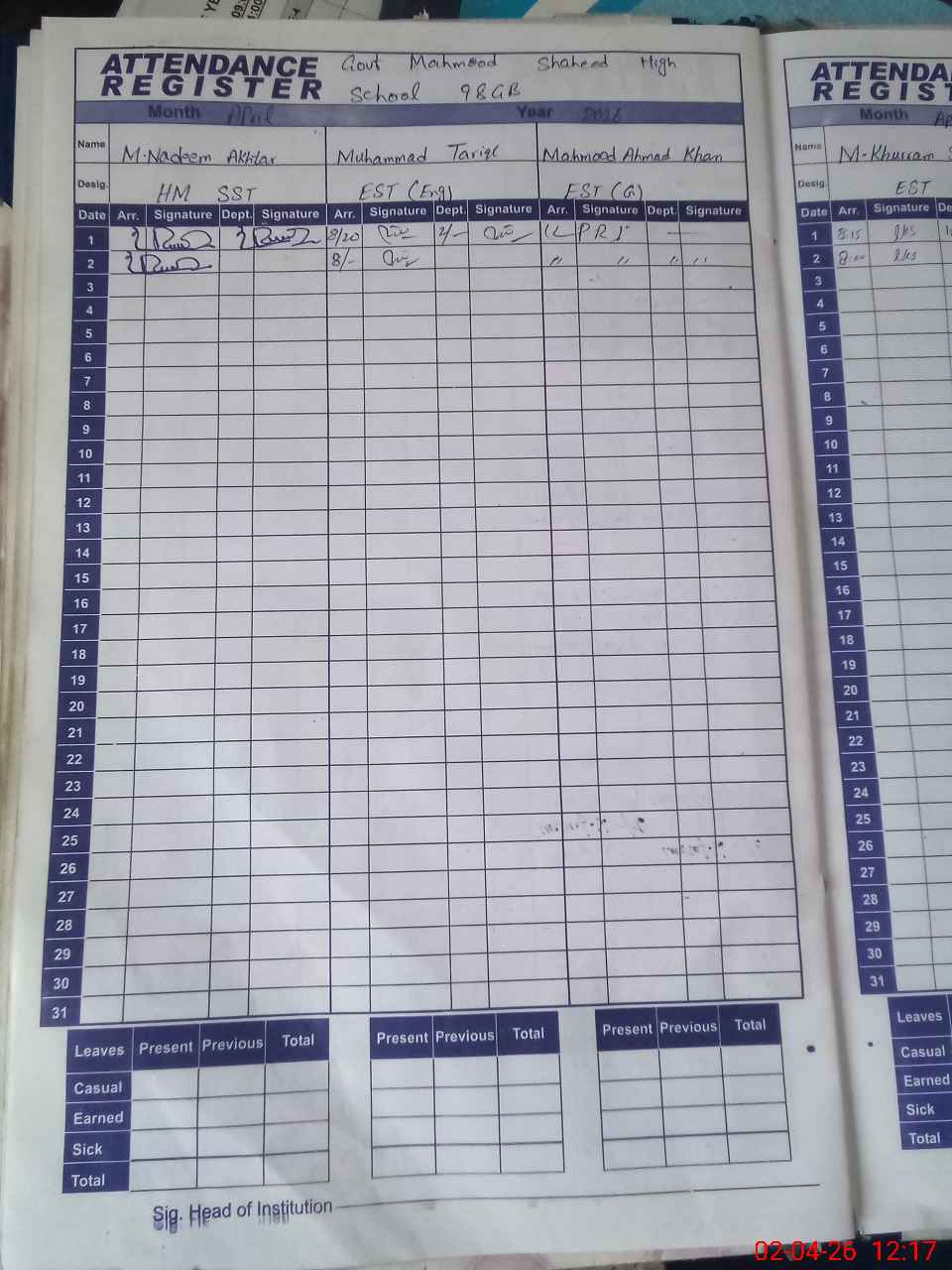 | CNIC | Full Name | Designation | R/C | Absence During Last Calender Month |
