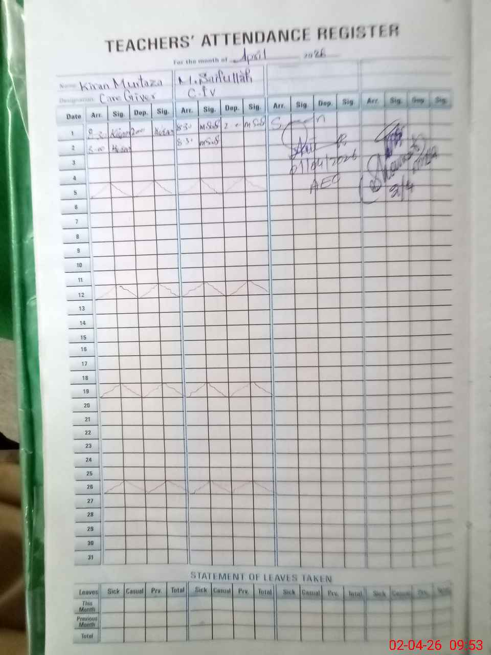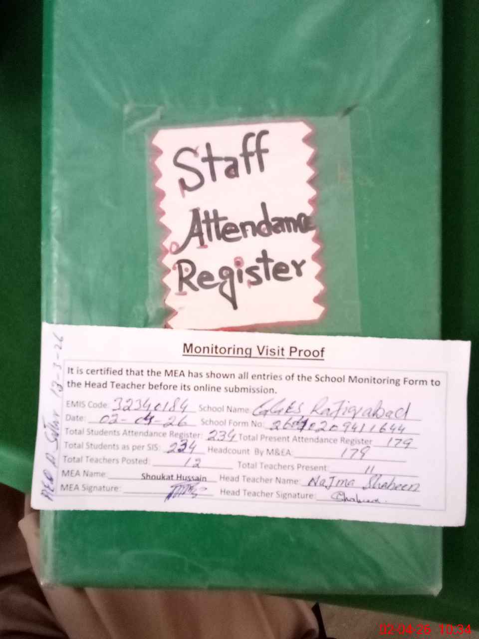 | Attendance Register | Head Teacher | MEA with School | Visit Proof |