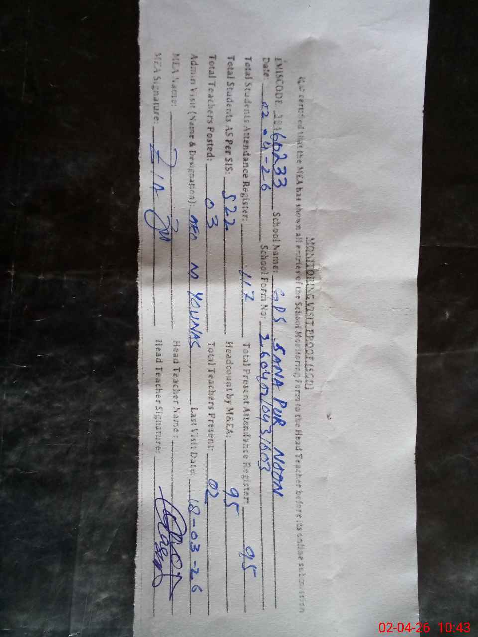 | Attendance Register | Head Teacher | MEA with School | Visit Proof |