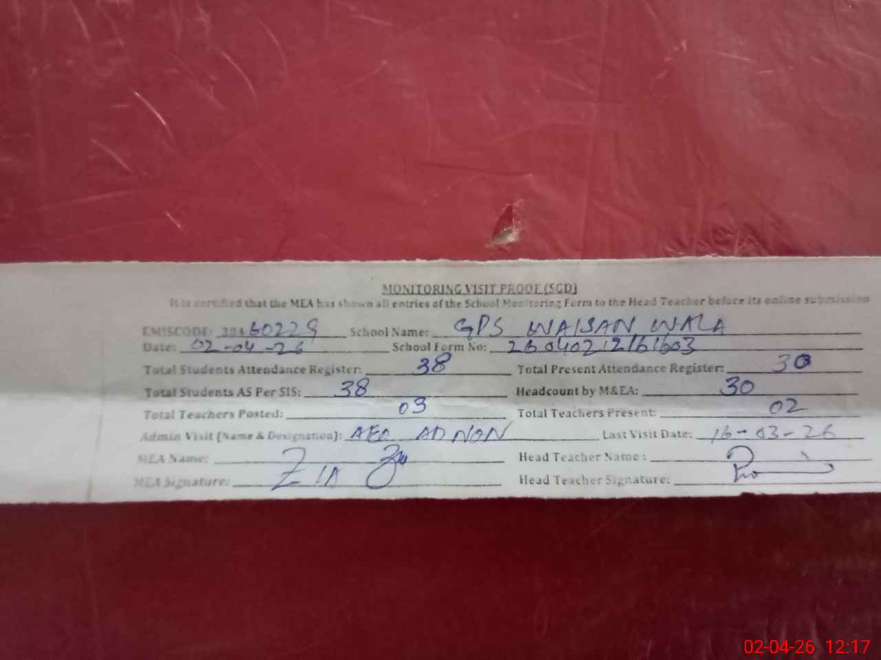 | Attendance Register | Head Teacher | MEA with School | Visit Proof |