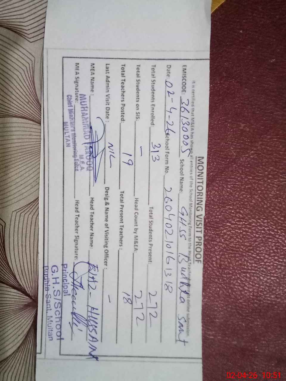 | EMIS Code: 36130005 | Name of School: GHSS BUDHLA SANT MULTAN | |||
