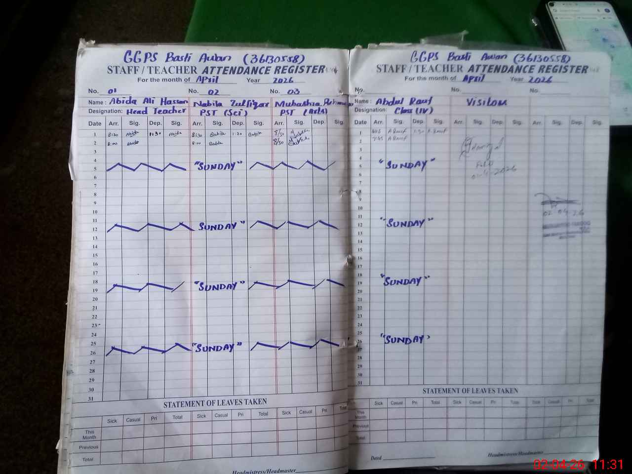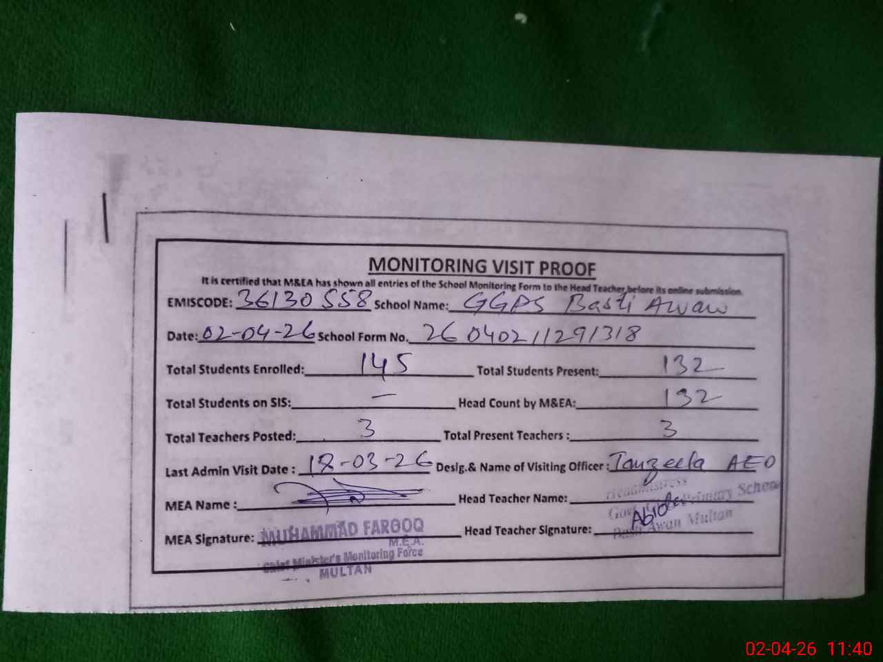 | Attendance Register | Head Teacher | MEA with School | Visit Proof |