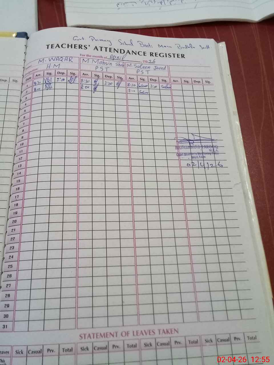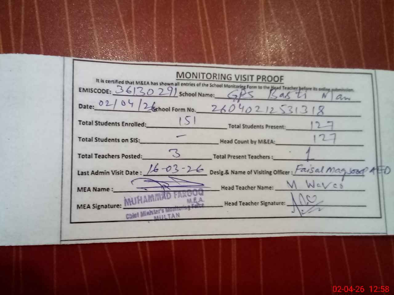 | Attendance Register | Head Teacher | MEA with School | Visit Proof |