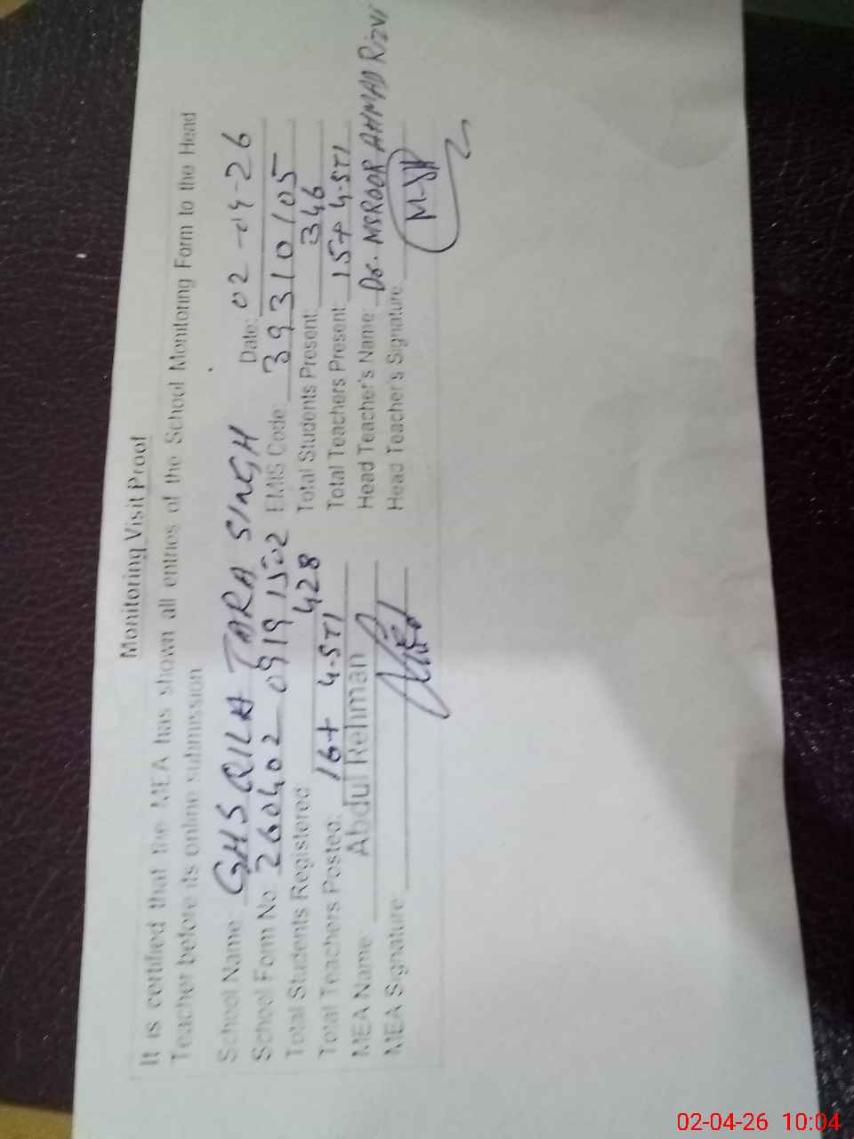 | Attendance Register | Head Teacher | MEA with School | Visit Proof |