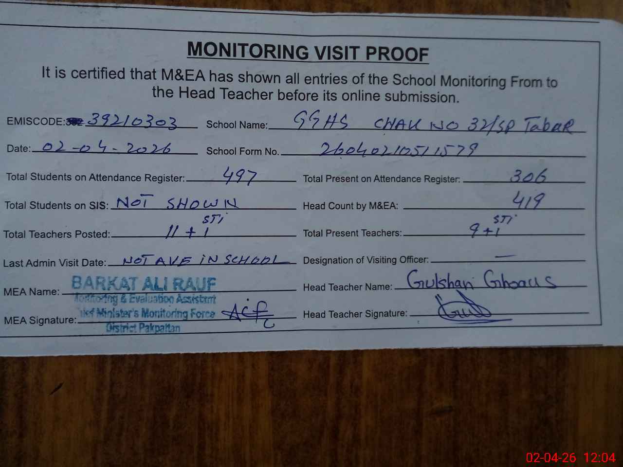 | Attendance Register | Head Teacher | MEA with School | Visit Proof |