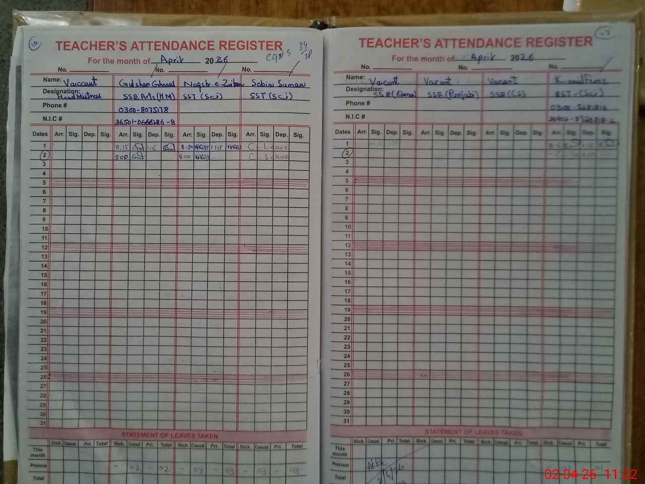 | Remarks (Use Separate Page if Required): FTF and NSB record uncomplet not updated in March 2026. D3 books record not available in school . log book not available in school. Mehwish Razaq STI is present in this school . | |||||