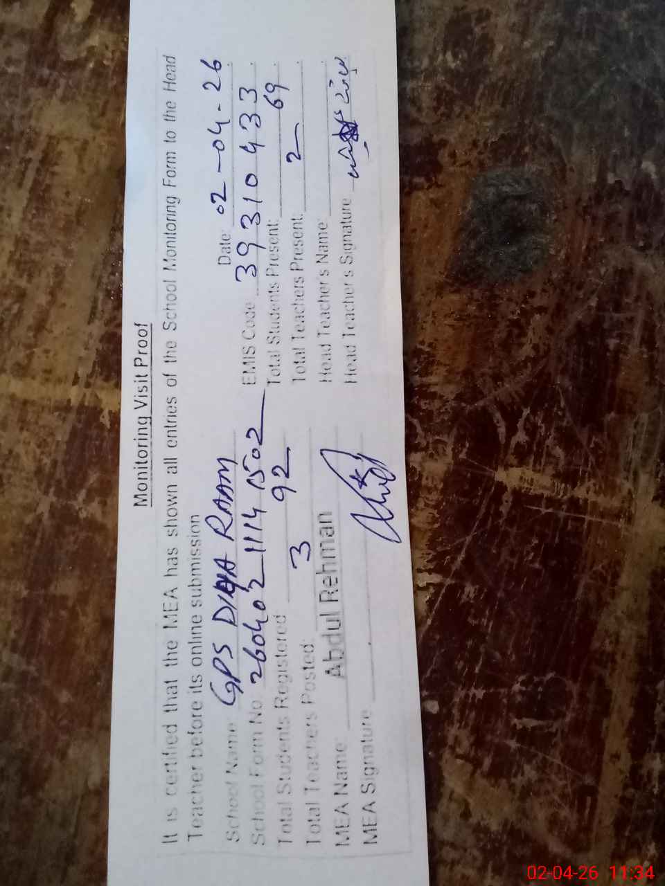 | EMIS Code: 39310433 | Name of School: GPS DIYA RAAM | |||