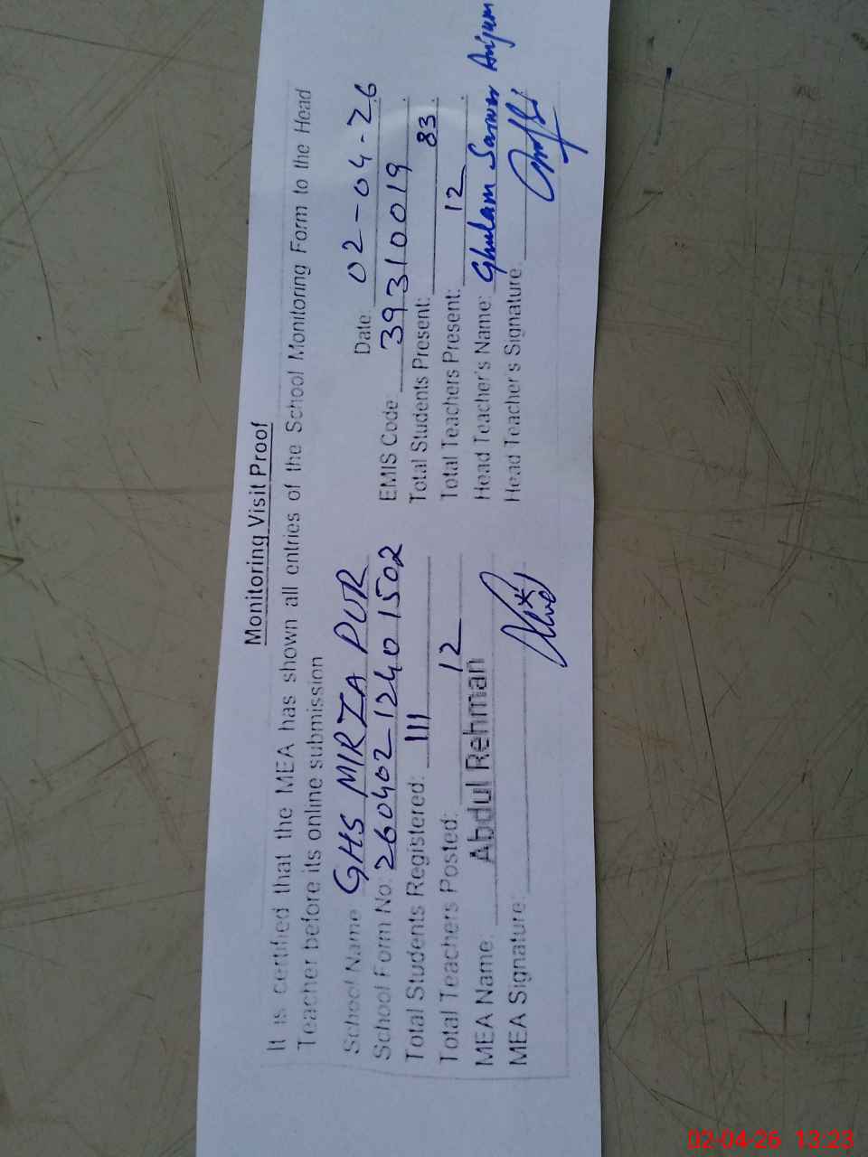 | Attendance Register | Head Teacher | MEA with School | Visit Proof |