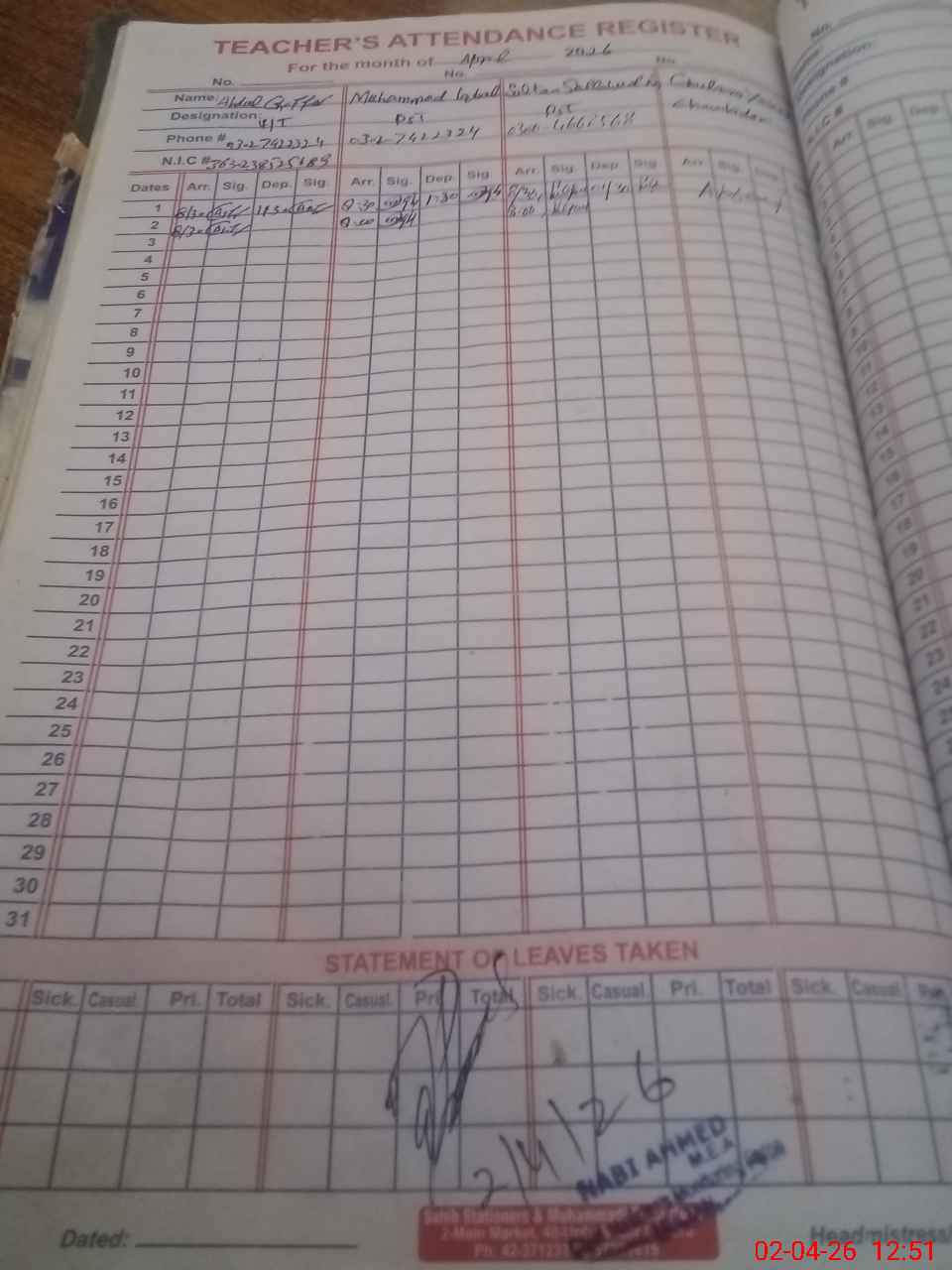 | Name: AB**** GH**** Designation: (School Headmaster's/Headmistress's) PST Phone/Cell Number: 03**** |
