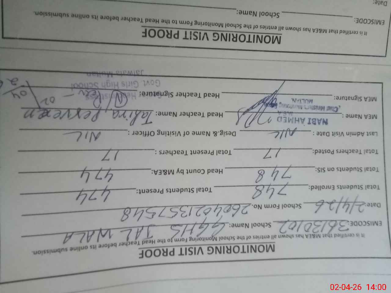| Attendance Register | Head Teacher | MEA with School | Visit Proof |