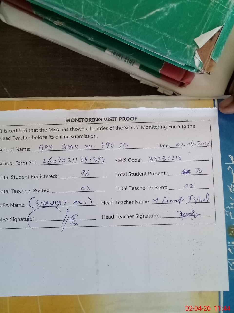 | EMIS Code: 33230213 | Name of School: GPS CHAK NO 494 JB | |||