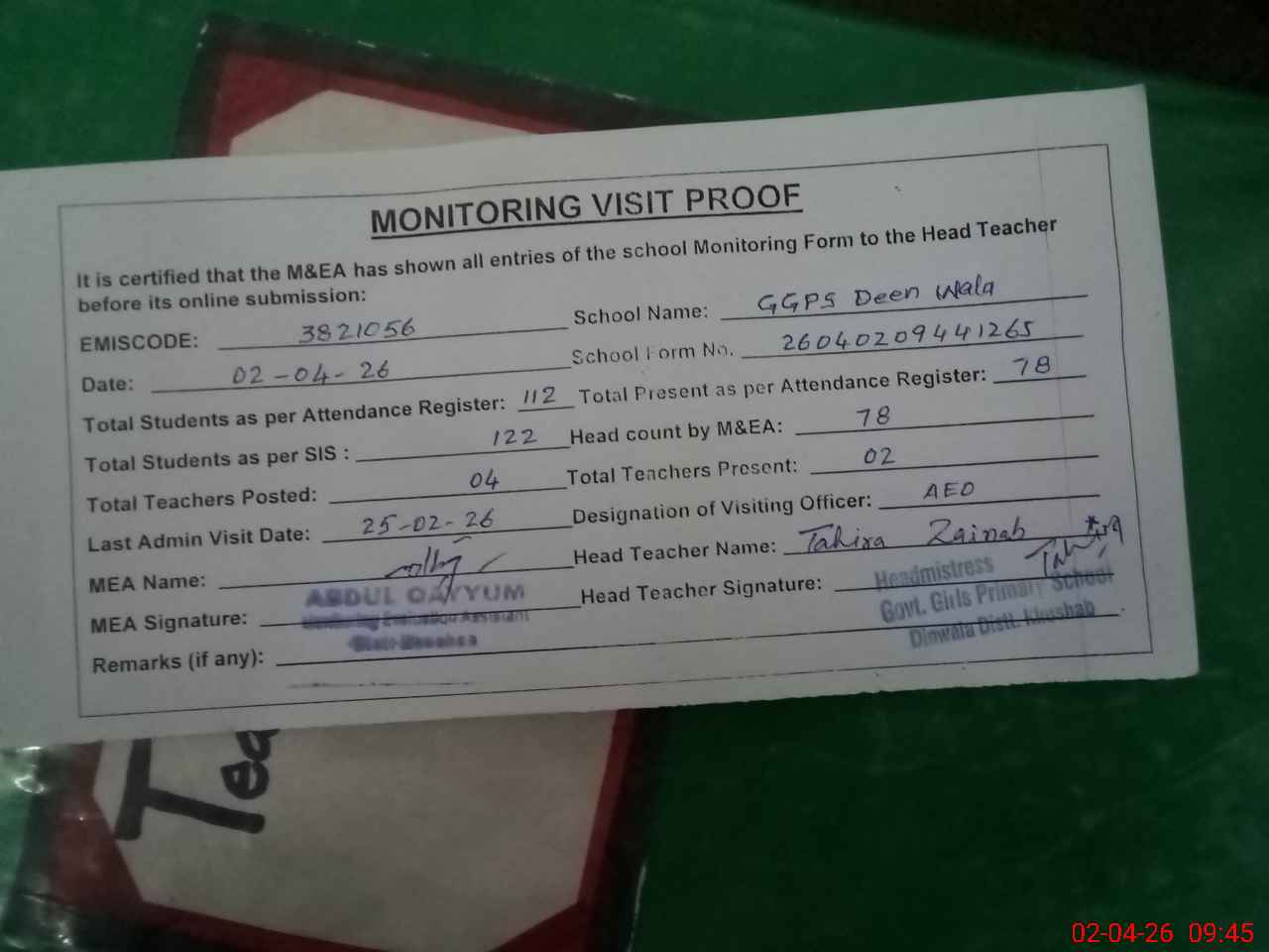 | Attendance Register | Head Teacher | MEA with School | Visit Proof |