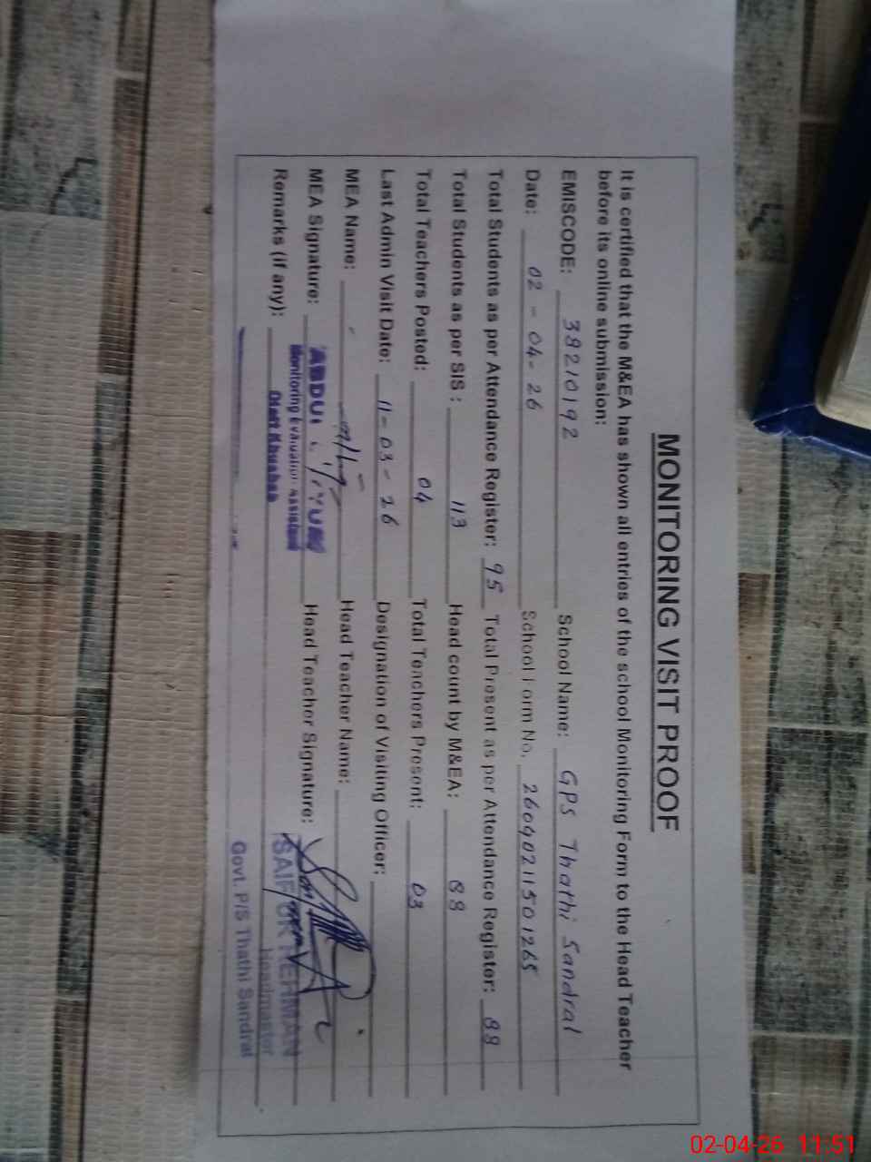 | Attendance Register | Head Teacher | MEA with School | Visit Proof |