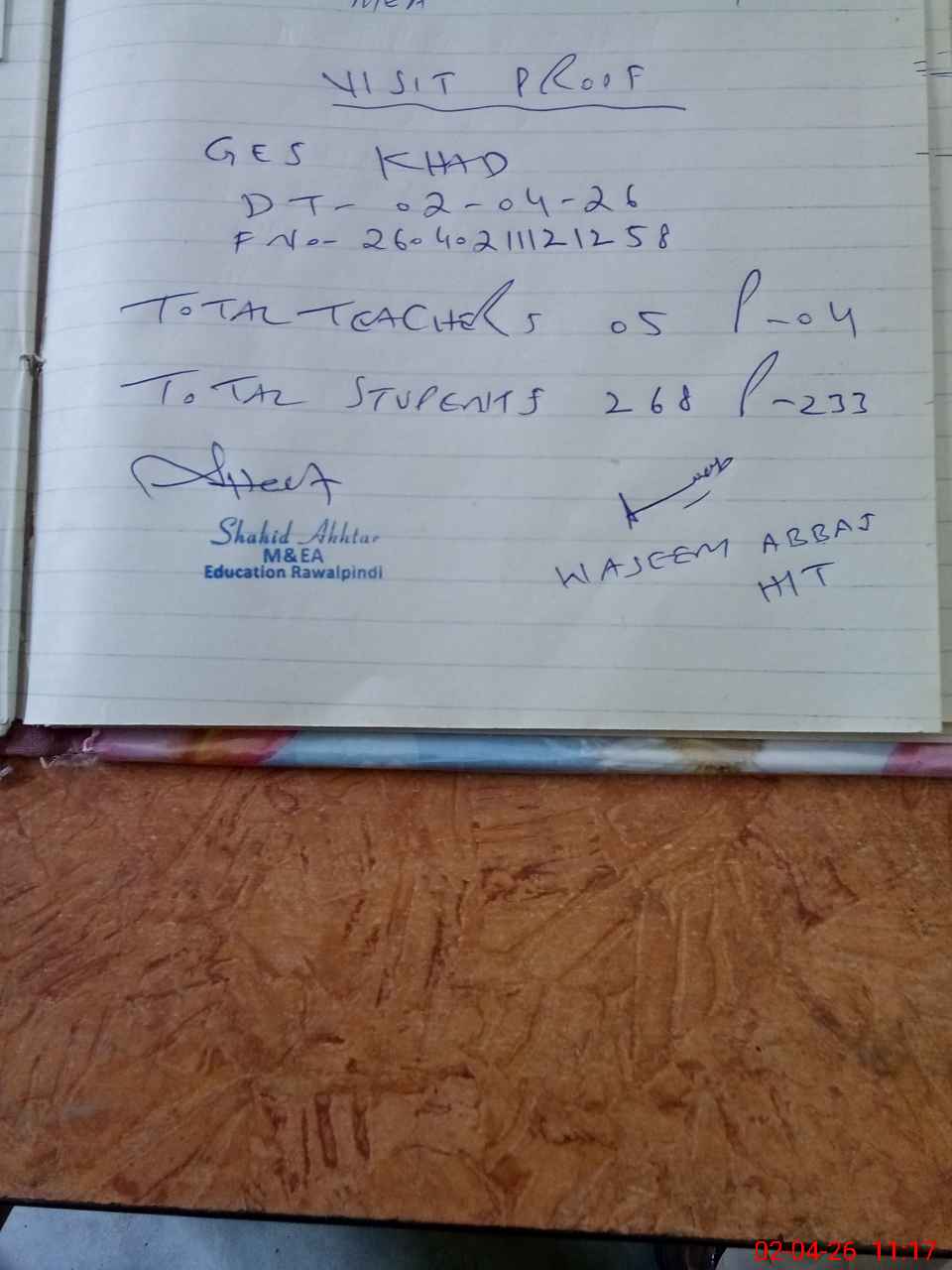 | Attendance Register | Head Teacher | MEA with School | Visit Proof |