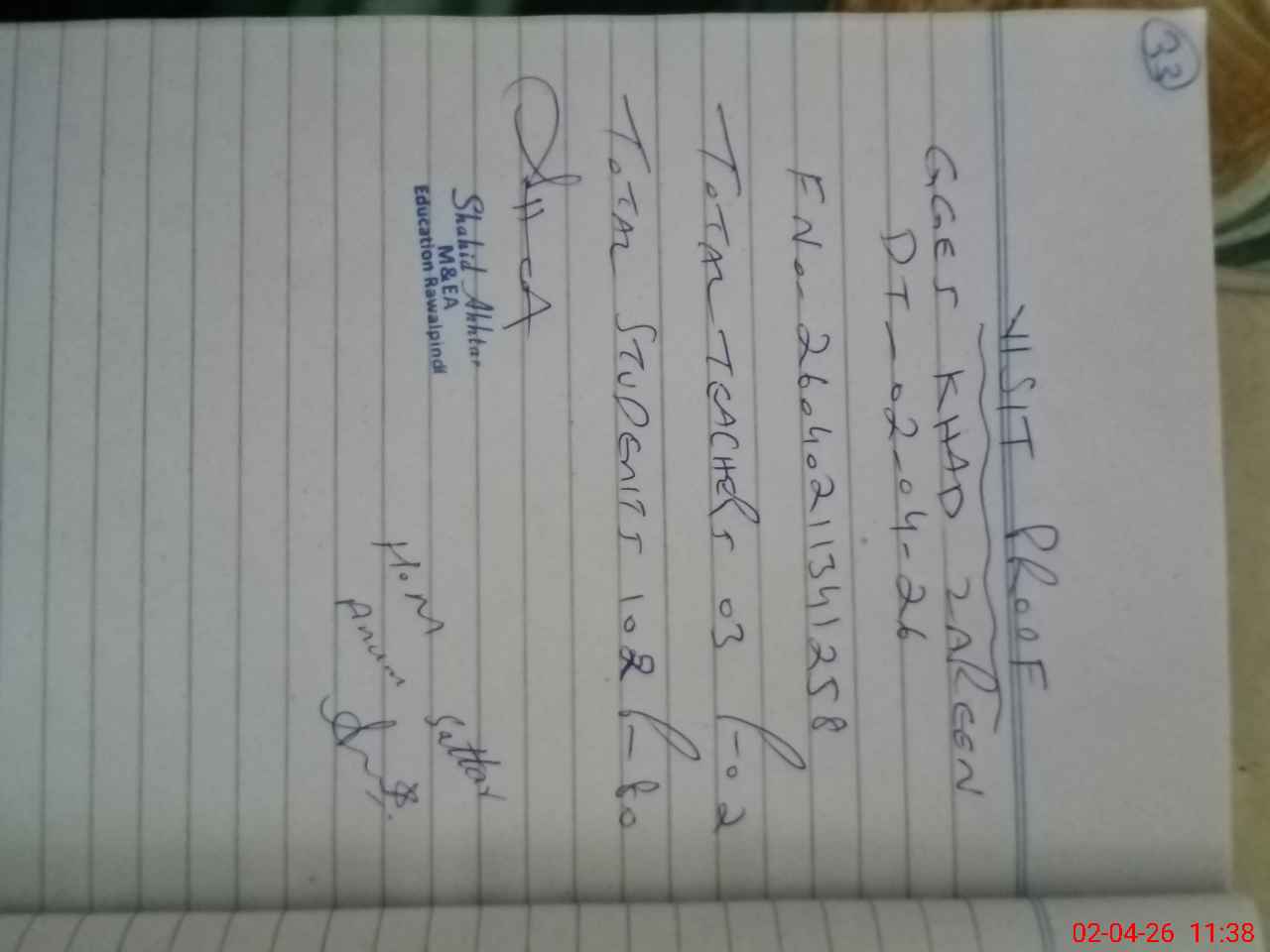 | Attendance Register | Head Teacher | MEA with School | Visit Proof |