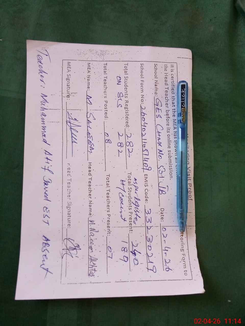 | EMIS Code: 33230219 | Name of School: GES CHAK NO 501 JB | |||