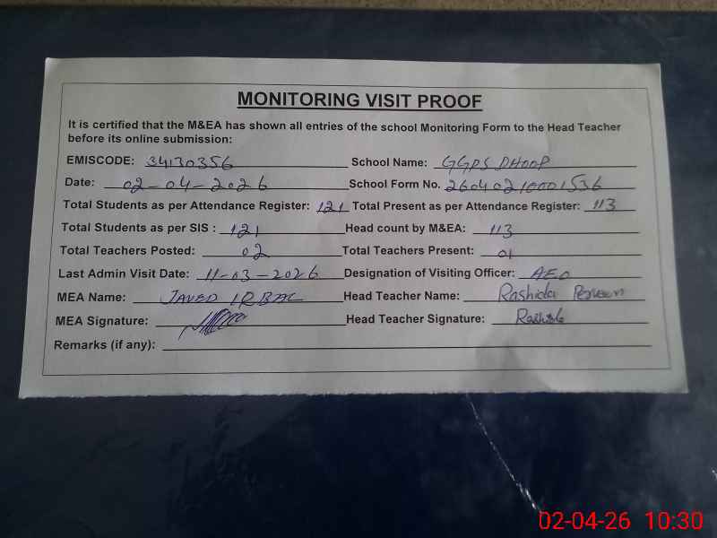 | EMIS Code: 34130356 | Name of School: GGPS DHOOP SARI | |||