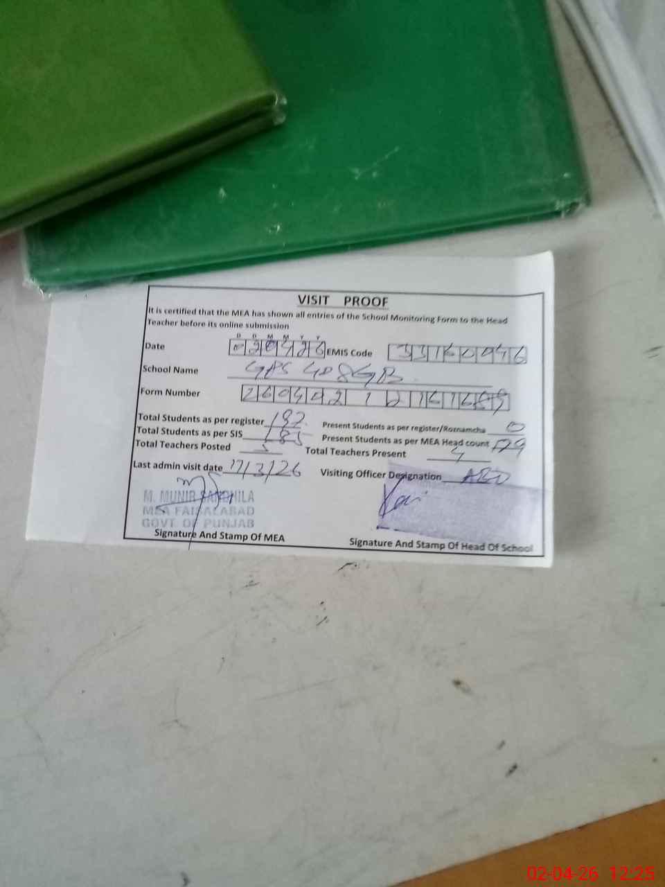 | Remarks (Use Separate Page if Required): student attendance registers not maintained roznamcha was no prepare for today cleanliness of lawns poor NSB and FTF record was not provided and prepared for March 2026 | |||||