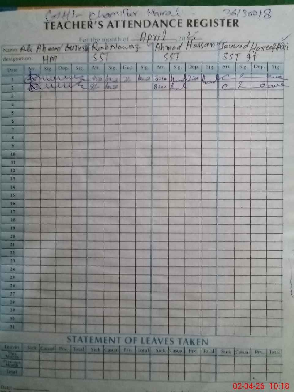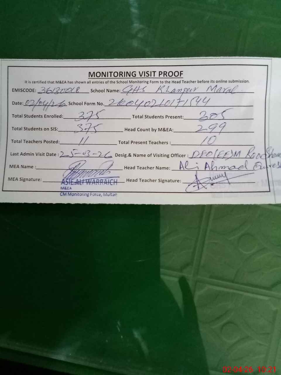 | EMIS Code: 36130018 | Name of School: GHS KHAN PUR MARAL VIA MAKHDOOM RASHID MULTAN | |||