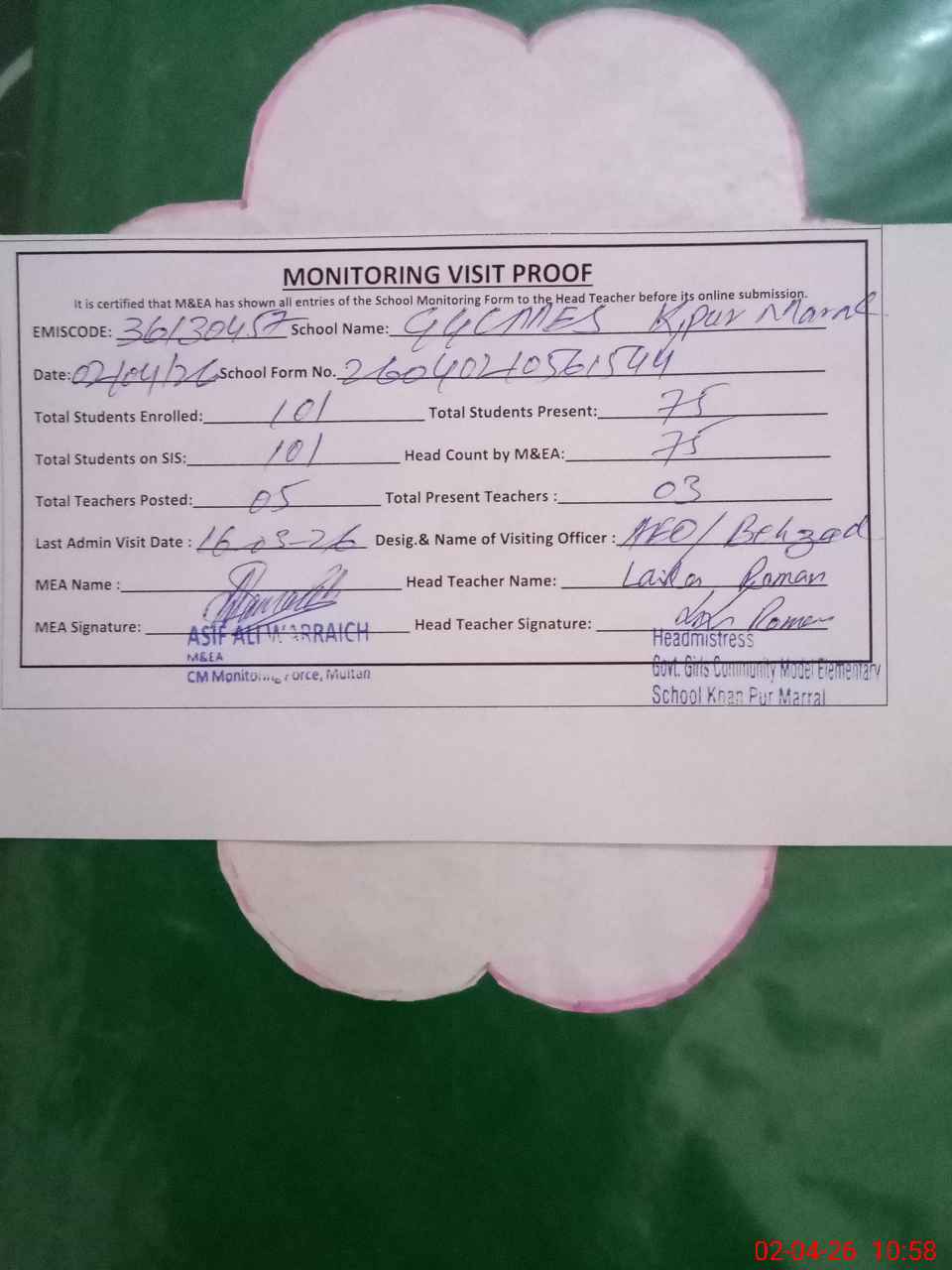 | EMIS Code: 36130457 | Name of School: GGCMES KHAN PUR MARAL MULTAN | |||