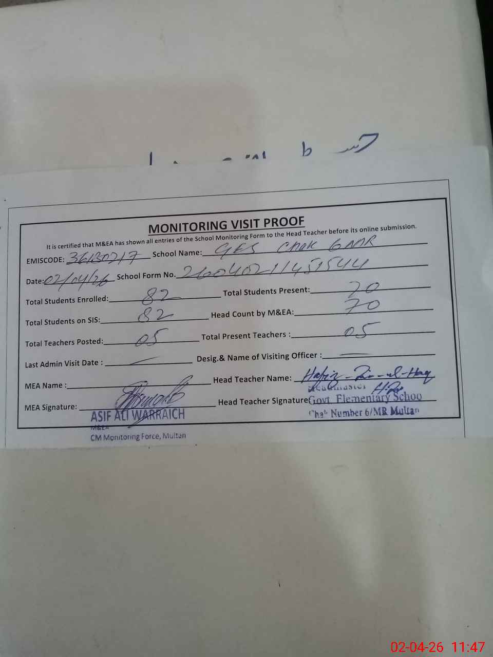 | Attendance Register | Head Teacher | MEA with School | Visit Proof |