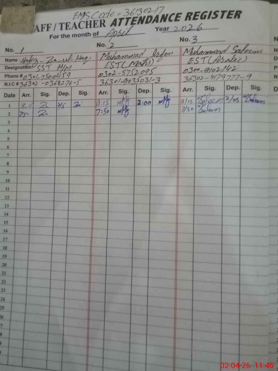 | Name: HA**** ZI**** ULHA**** Designation: (School Headmaster's/Headmistress's) SST G Phone/Cell Number: 03**** |