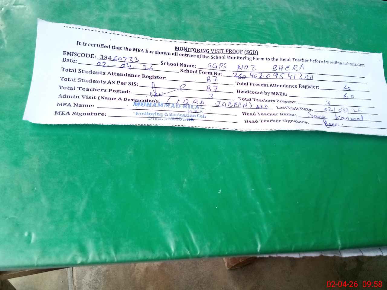 | Attendance Register | Head Teacher | MEA with School | Visit Proof |