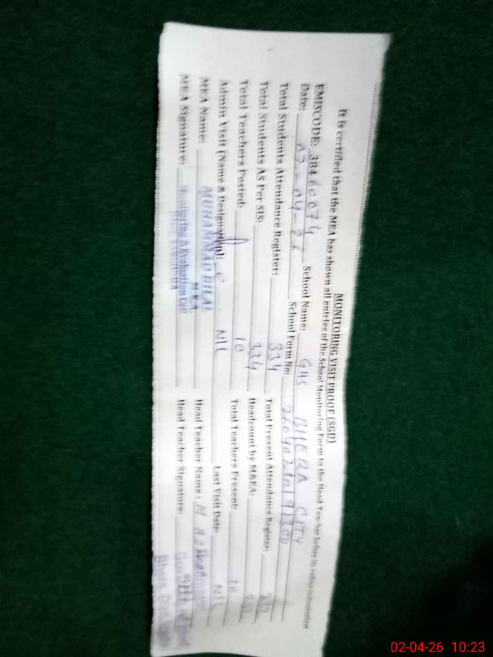 | Attendance Register | Head Teacher | MEA with School | Visit Proof |