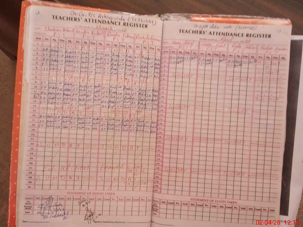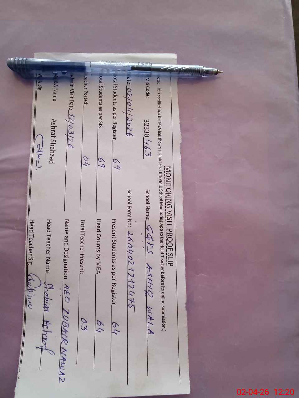 | Attendance Register | Head Teacher | MEA with School | Visit Proof |