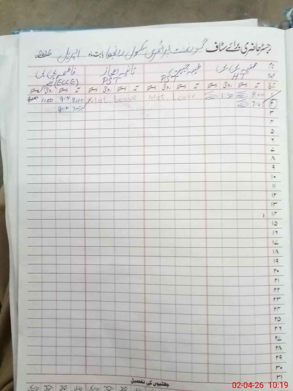 | 37**** | Ta**** Ja**** | PST Science/Maths | Regular | 31 | 0 | 0 | 31 | 0 | 0 | 0 | 0 | 0 | Maternity |
