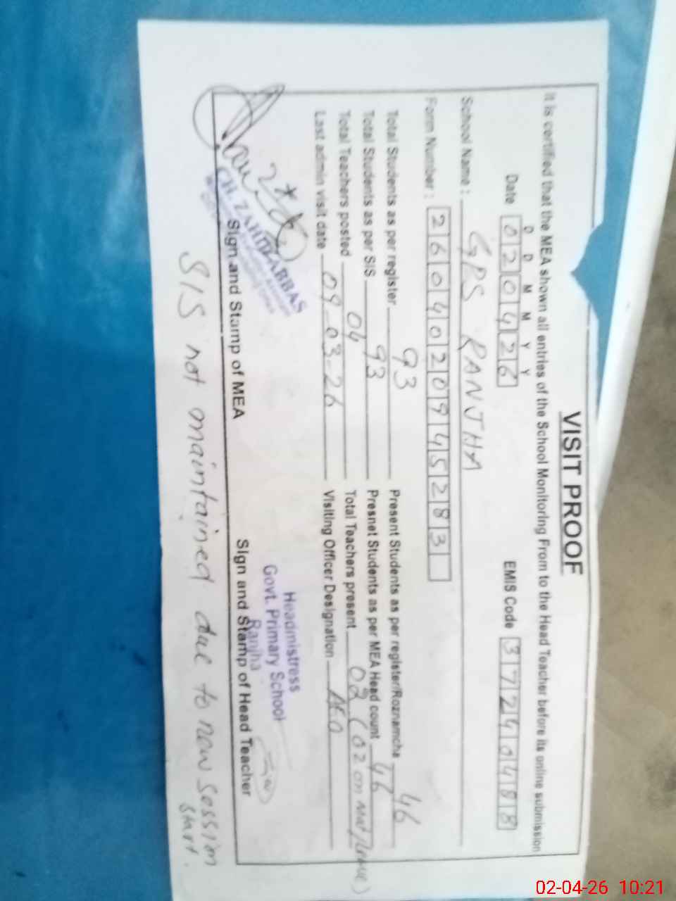 | Attendance Register | Head Teacher | MEA with School | Visit Proof |