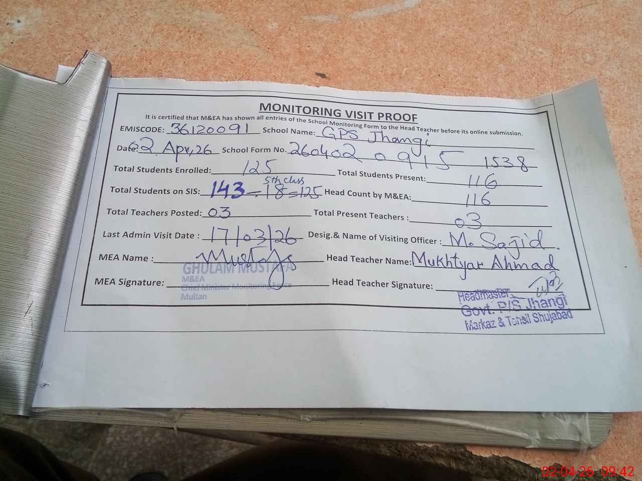 | EMIS Code: 36120091 | Name of School: GPS JHANGI P/O BAGRAIN TEH SHUJABAD | |||