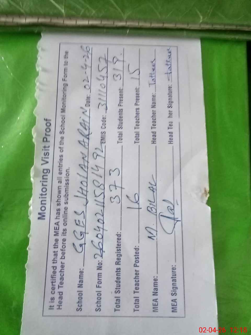 | Attendance Register | Head Teacher | MEA with School | Visit Proof |
