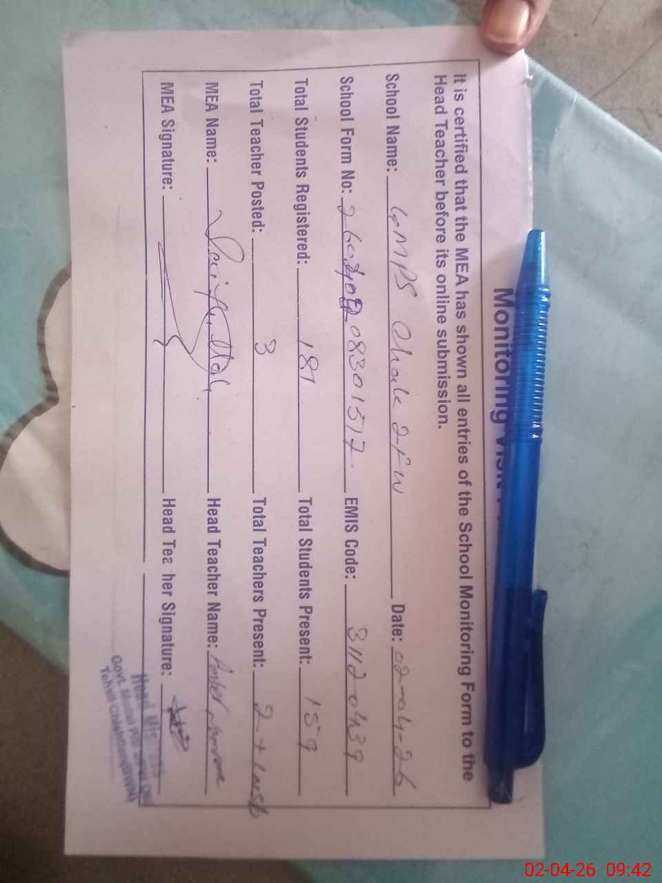 | EMIS Code: 31120439 | Name of School: GMPS CHAK NO. 2/FW | |||