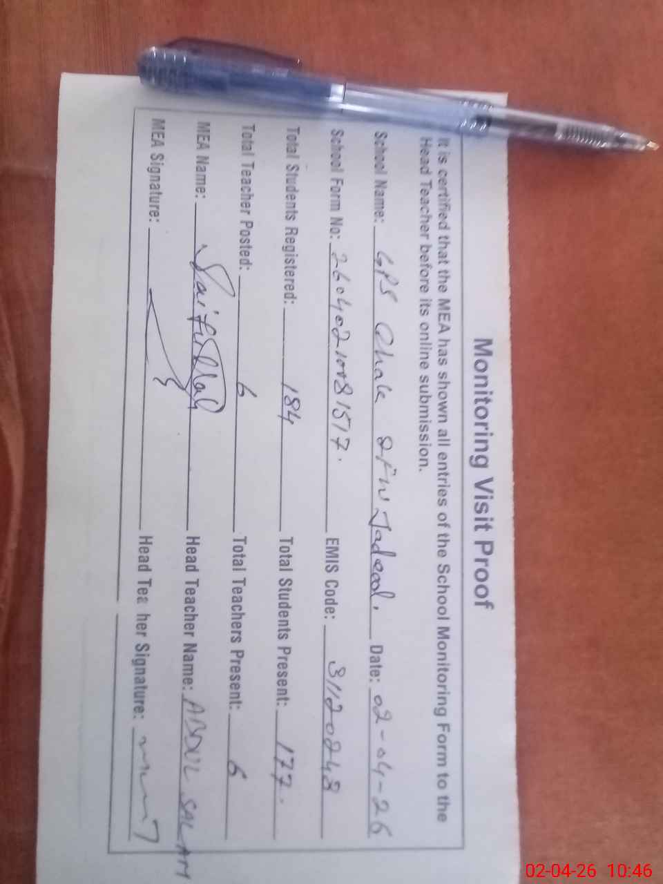 | EMIS Code: 31120248 | Name of School: GPS CHAK NO. 2/FW (JADEED) | |||