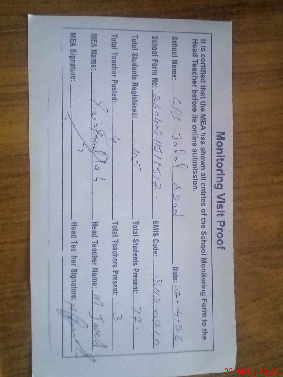 | Attendance Register | Head Teacher | MEA with School | Visit Proof |