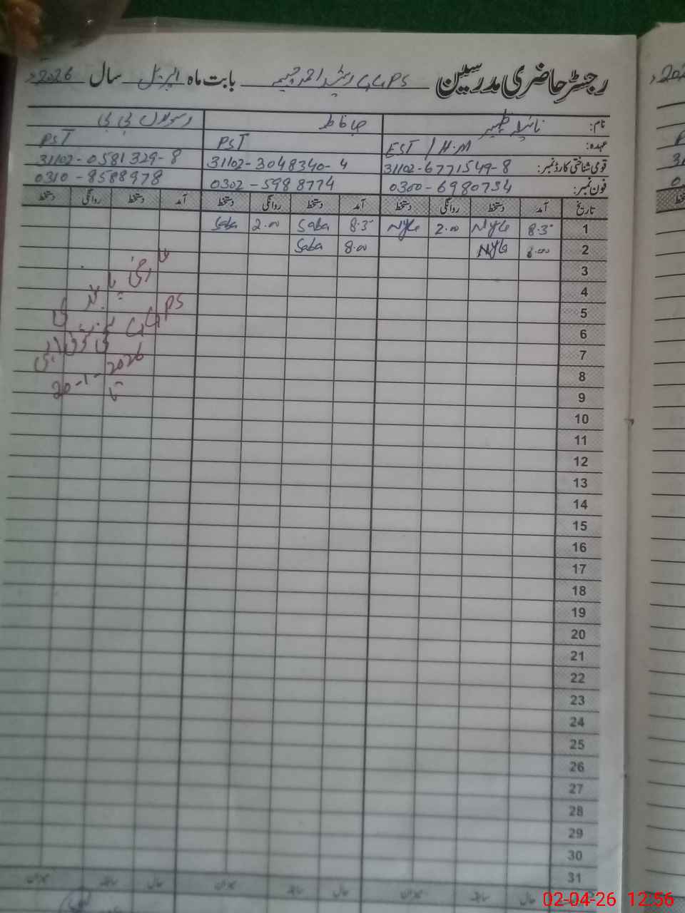 | CNIC | Full Name | Designation | R/C | Absence During Last Calender Month |